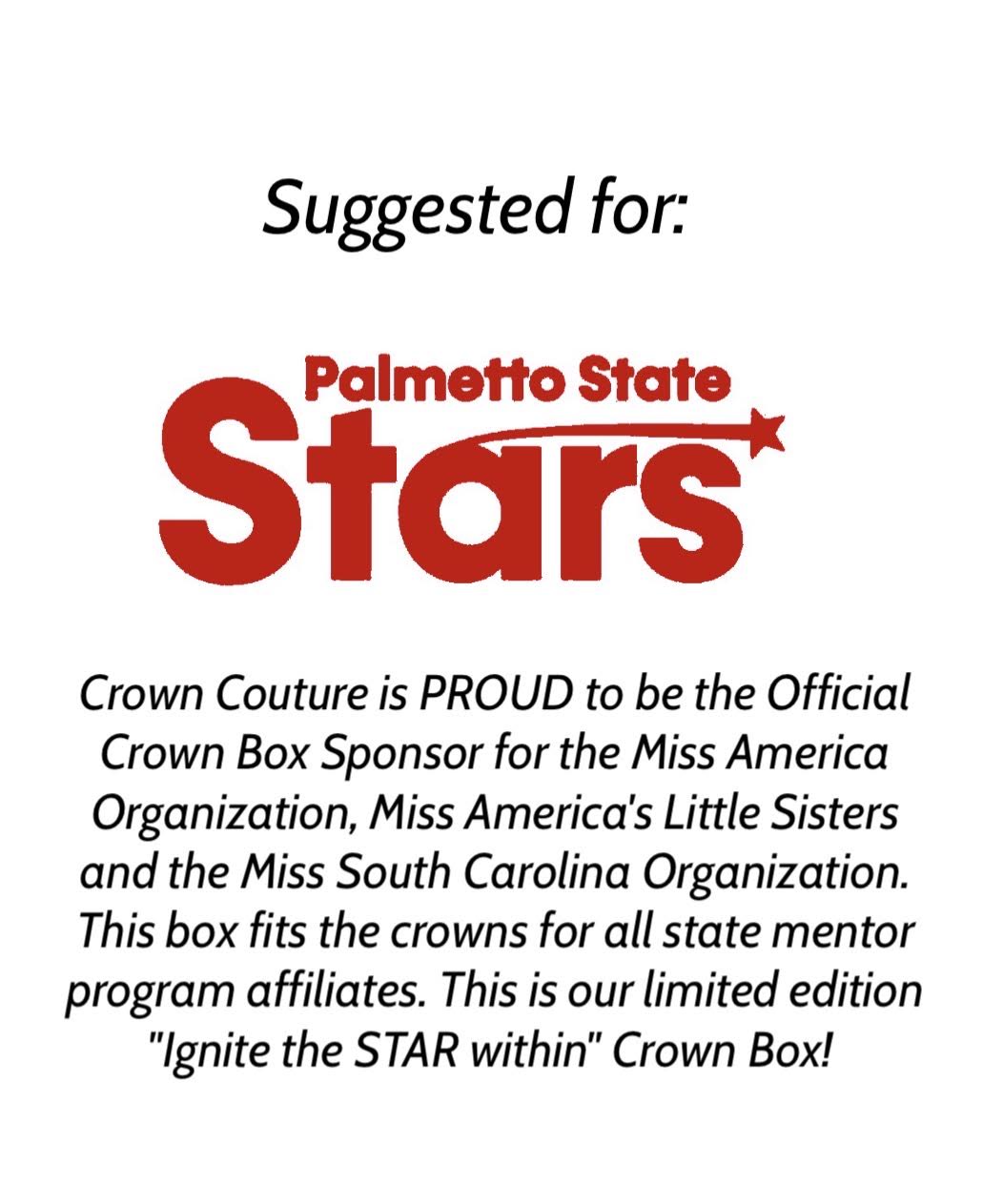 Have specific colors in mind? Different dimensions you’d like? Crown Couture can customize to fit every crown. We offer over 40 color and sizing options. Please email for additional information regarding customization and become a #CrownCoutureGirl!